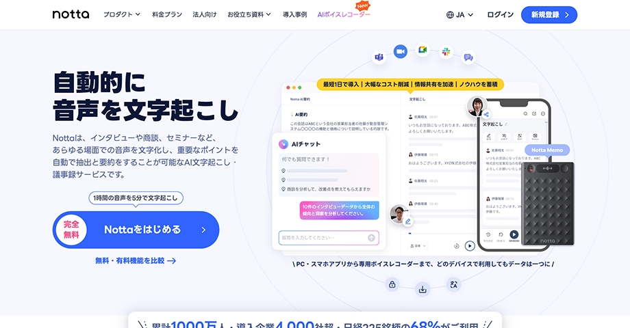 「Notta」は、高精度かつ多機能なAI文字起こしサービスとして知られています。