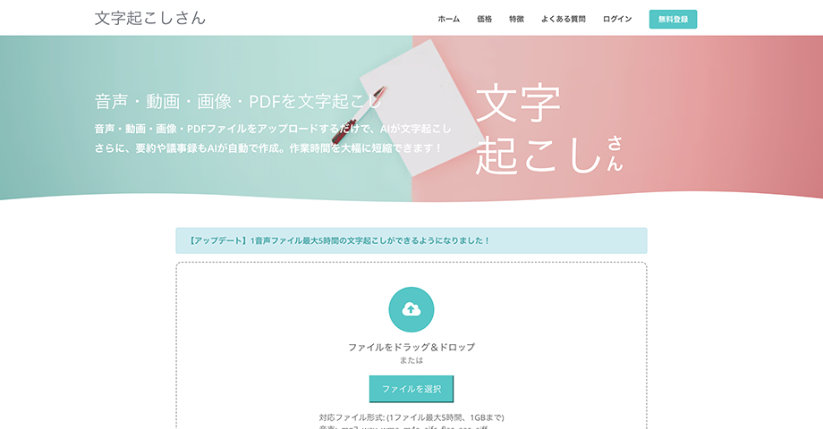 「文字起こしさん」はブラウザから簡単に開始でき、インストール不要で即座に文字起こし作業に取りかかれるサービスです。ログを残さず、ユーザーの通話録音データがAIの学習に利用されたりすることが無いため、セキュリティ的にも安心です。料金は、無料では最初の3分のみ文字起こし可能で、「ベーシックプラン〈1,100円(税込)/月〉」では月に24時間・1ファイル最大90分まで文字起こし可能です。